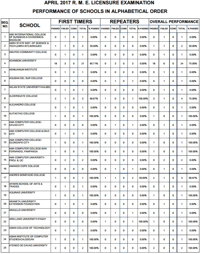 The performance of schools in the April 2017 Registered Master Electrician Licensure Examination in alphabetical order as per R.A. 8981 otherwise known as PRC Modernization Act of 2000 Section 7(m) “To monitor the performance of schools in licensure examinations and publish the results thereof in a newspaper of national circulation” is as follows: