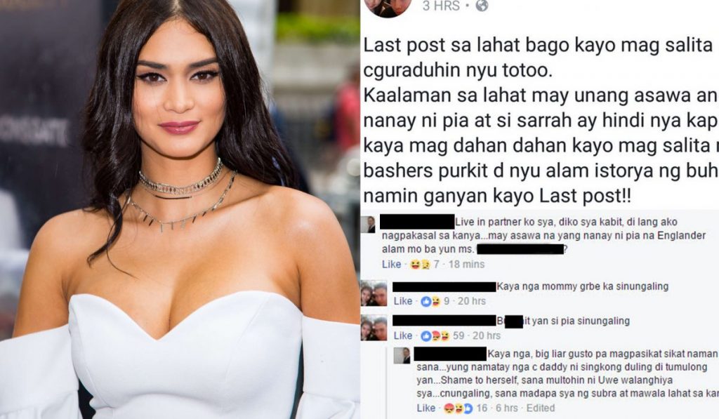 “What a hell you doing Pia Alonzo Wurtzbach, making a false story oh yeah you are a big liar your papa never ask money from you, shame to yourself…Your mama got an affair with neighbor name Jojo, that’s why papa abandoned your mother and you pretty wow know that all…” Robie Asingua said on her post.