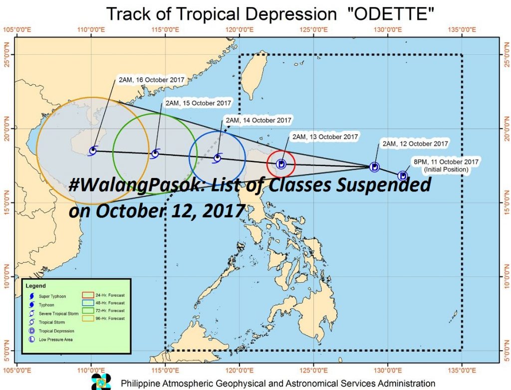 #WalangPasok on October 12, 2017 due to Tropical Depression Odette. PAGASA release statement of Bagyong Odette.