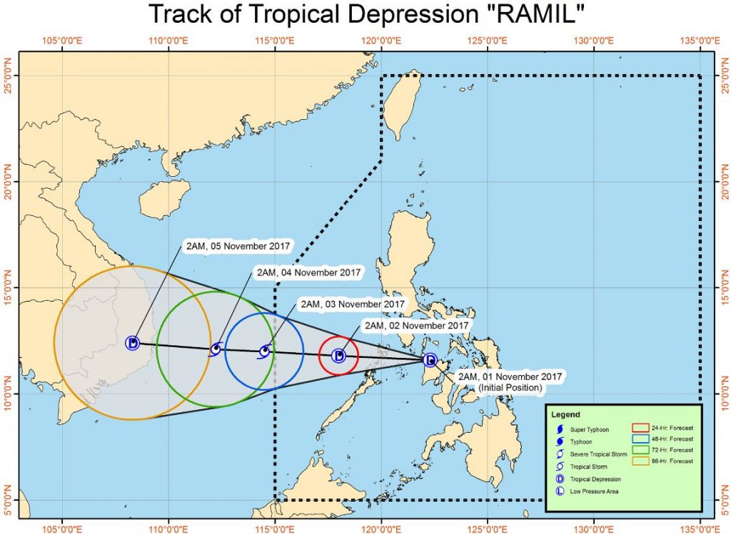 During 4:00 am forecast, the center of Tropical Depression “RAMIL” was estimated based on all available data at 115 km West of Roxas City, Capiz (11.7 °N, 121.7 °E).