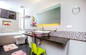 Ryzza’s Bathroom looks so cute with a small green chair and some pink hello kitty designs.