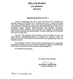 December 26, 2017 and January 2, 2018 is consider as a non- working holiday to give employees and students a longer break, according to Memorandum Circular 37 signed by Executive Secretary Salvador Medialdea on Wednesday. Malacañang suspended all works in government and non-government offices.