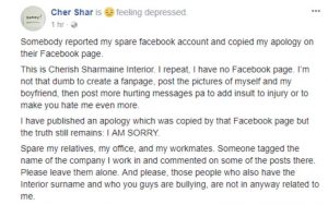 Cherish Sharmaine Interior finally made her apologies through social media. In her post pleads to spare her company, family and even people with the same surname as her.
