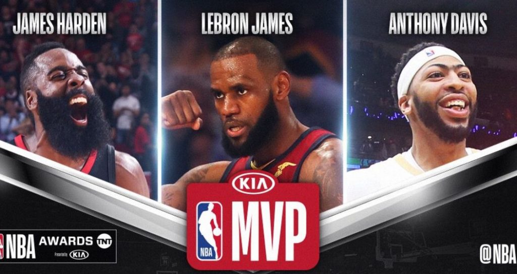 According to NBA Twitter account, “The three finalists for #KiaMVP… @JHarden13, @KingJames and @AntDavis23! The 2018 #NBAAwards air 6/25 @NBAonTNT.”