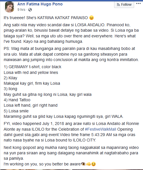 According to Ann Fatima Hugo Pono, she carefully studied and make comparison of every detail in the photos. With her expertise of scrutinizing genuine and fake photos, she came up with conclusion that the Snapchat Leak Video previously attributed to Loisa Andalio is fake and not true. It shows that Katrina “KatKat” Paraiso is the one who appears in the viral Snapchat Leak Video.