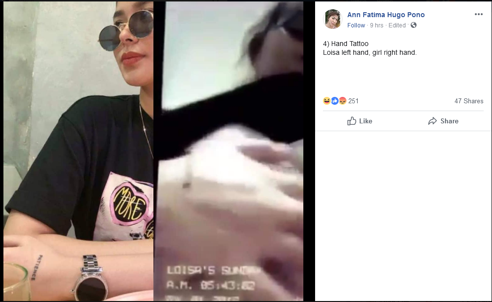 2. c loisa tlga yan…about sa tattoo, tanga din ung ngpapakaeksperto kuno na nasa left hand at right hand ang pgkakaiba kung saan nkatatak ung tattoo…syempre nkaselfie (front cam) ung pgkakuha,natural n baliktad tlga ang pgkakuha,mkikita na left hand ang nasa video imbis na ung right hand…tsaka cnasabi pa na walang lines sa smile,eh hnd nga high resolution ang pgkakuha ng video..pg hnd high resolution,d tlga makita ang small details lalo na pag video pa…pati ung sa ilong,hnd tlga makita ang pgkakaiba dahil hnd nga malinaw ang pgkakuha ng video…about sa shirt na may guhit sa gilid ng sleeve,hnd rin yan batayan kc hnd nmn nkatagilid ung nasa video,kaya may tendency na hnd tlga mkita ung guhit na un…and sa totoo lang, malayong malayo tlga sa mukha ni katkat paraiso ung video…its definitely loisa…wala nmn tattoo na ganun c katkat…