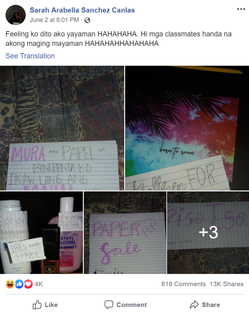The student was Sarah Arabella Sanchez Canlas. She shared a post on Facebook showing pictures of her things with prices, for those who could possibly borrow or ask things from her. With the caption, “Feeling ko dito ako yayaman HAHAHAHA. Hi mga classmates handa na akong maging mayaman HAHAHAHHAHAHAHA.”