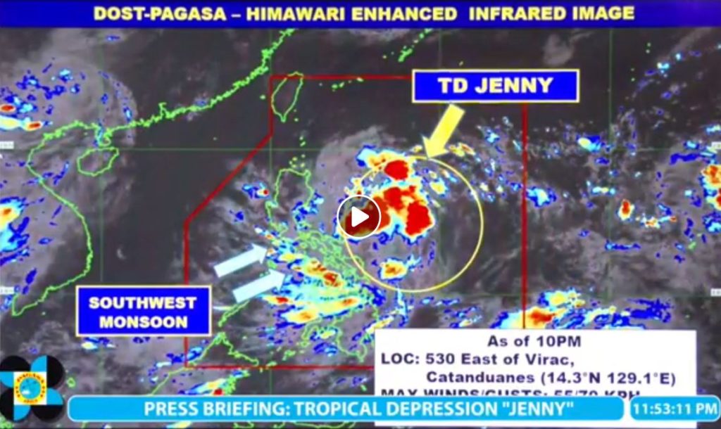 At 10:00 PM today, the center of Tropical Depression “JENNY” was estimated based on all available data at 530 km East of Virac, Catanduanes (14.3 °N, 129.1 °E )