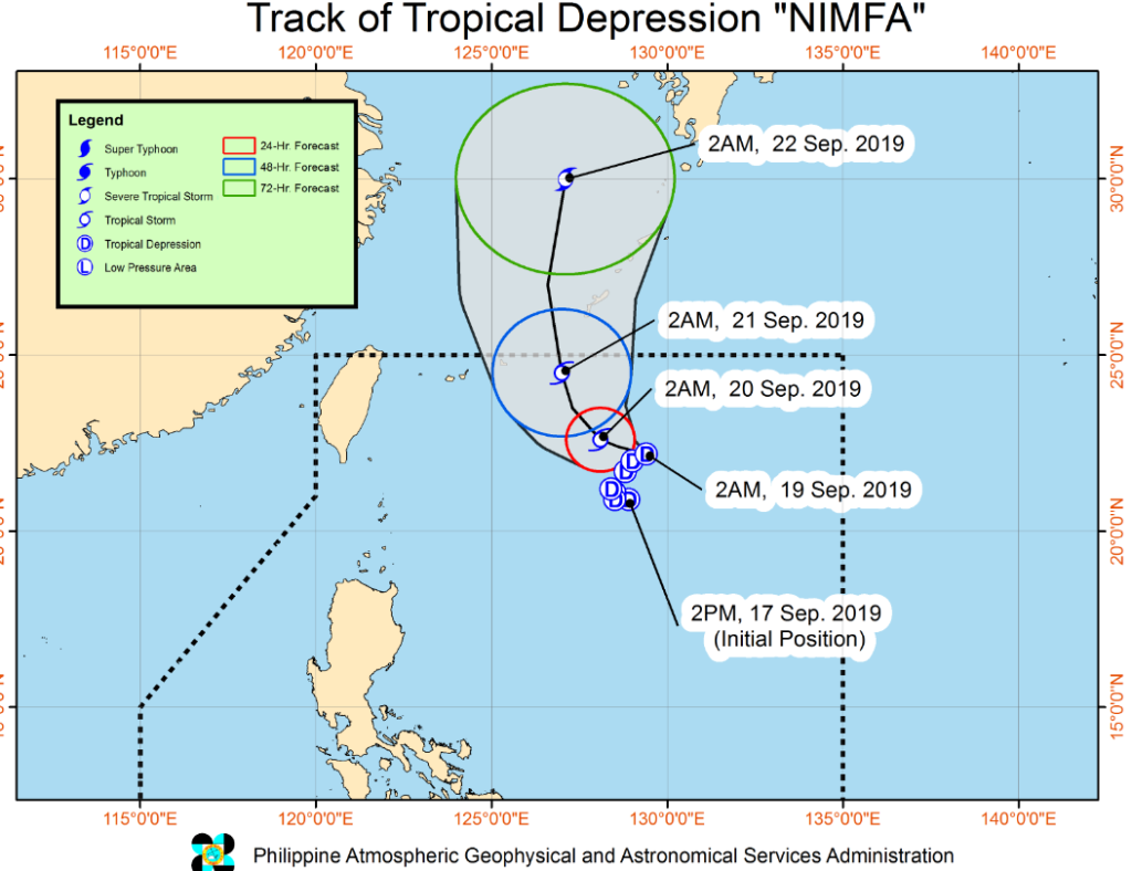 The Philippine Atmospheric, Geophysical and Astronomical Services Administration (PAGASA) announces updates of Bagyong ‘Nimfa’. The Tropical Storm Nimfa as of 3:00 AM today, the center of Tropical Depression “NIMFA” was estimated based on all available data at 785 km East Northeast of Basco, Batanes (22.2 N, 129.3 E) with maximum sustained winds of 55 km/h near the center and gustiness of up to 70 km/h. It is moving northeast slowly. Southwest Monsoon affecting Central and Southern Luzon and Western Visayas.