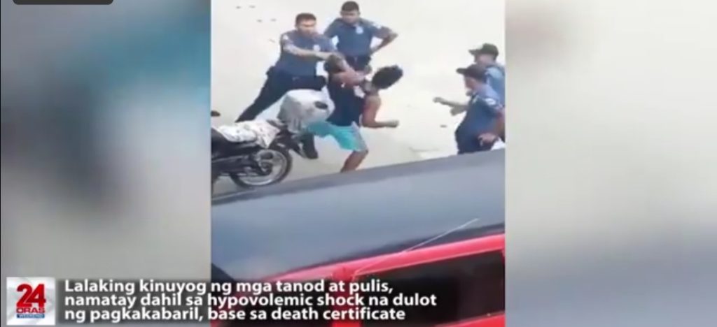 In the video you can see the man is holding a steel bar which considers to be a threat and upod arrest the police throw two punches which hurt the victim and even shot him in the knee.