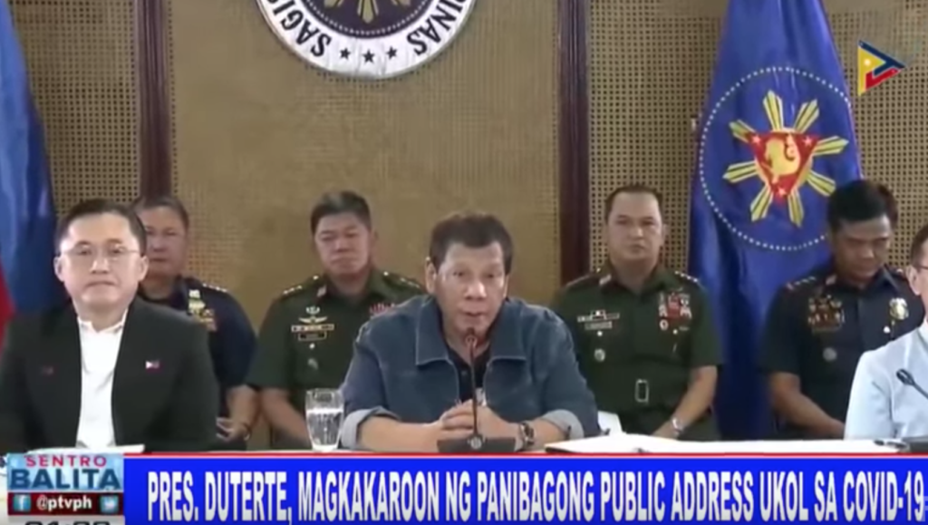 President Rodrigo Duterte to address the public on Monday “tentatively at 4:00 pm,” Presidential Spokesman Salvador Panelo says. According to Senate President Vicente Sotto III, “I expect to receive a report on [the] distribution of financial aid to the 18 million families of the informal sector, mass testing especially in urban areas, [and] prioritization of the safety and welfare of the frontline health workers.”