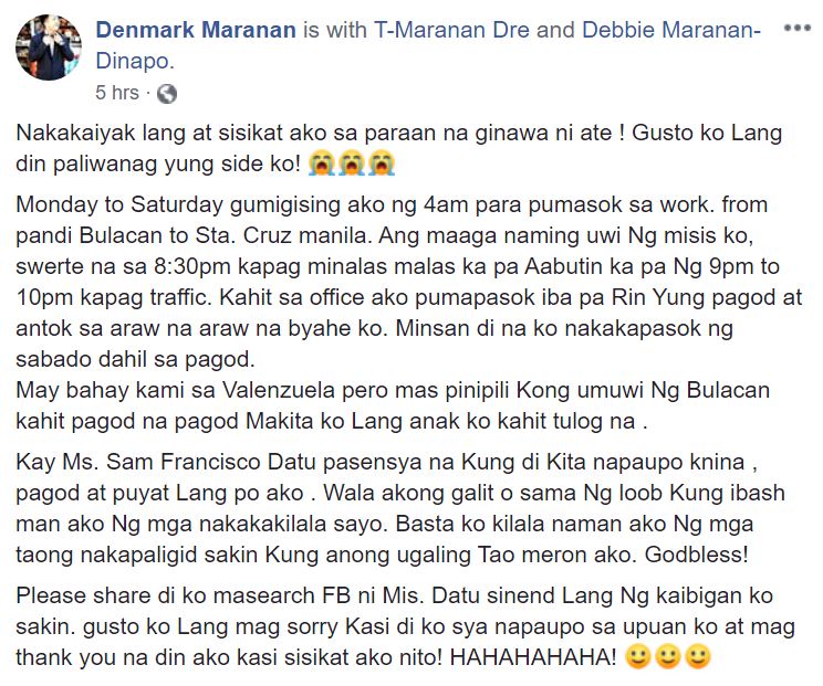 “nagpost ako nasa bus ako pero hindi si kuya (Denmark) ang pinopoint niya na hindi ako pinaupo. Pag post ko nun una, di ko nalagyan ng emoji, tapos ginawa ko, pinalitan ko, nilagyan ko ng emoji kasi nga baka mamaya magkaroon ng issue… baka masabi na siya ang pinopoint ko. Pero di siya talaga yun. Tapos nagulat ako ngayon na may kumakalat na post na binilugan yun mukha niya… sa kin kasi, sa ibang followers ko, mahilig ako magpost ng mga kalokohan at joke. Di ko naman alam na maraming magrereact. Nun marami ng nagrereact, binura ko na.”