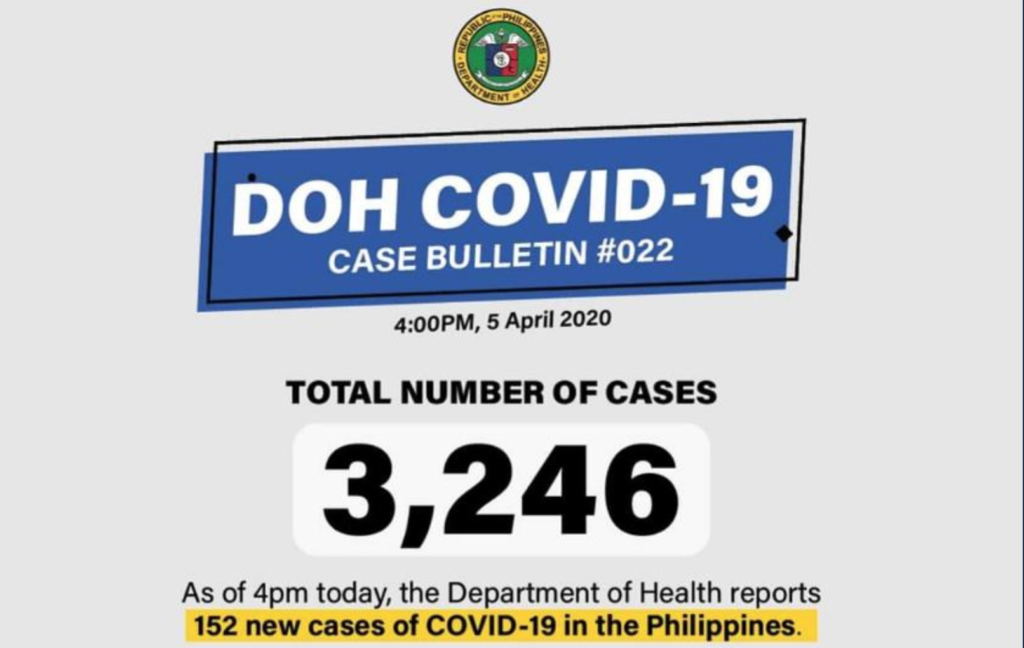 In GMA news reports, DOH reports 152 new COVID-19 cases, 8 new deaths, and 7 new recoveries. This brings the totals to 3,246 confirmed cases, 152 deaths, and 64 recoveries as of 4 pm today, April 5.