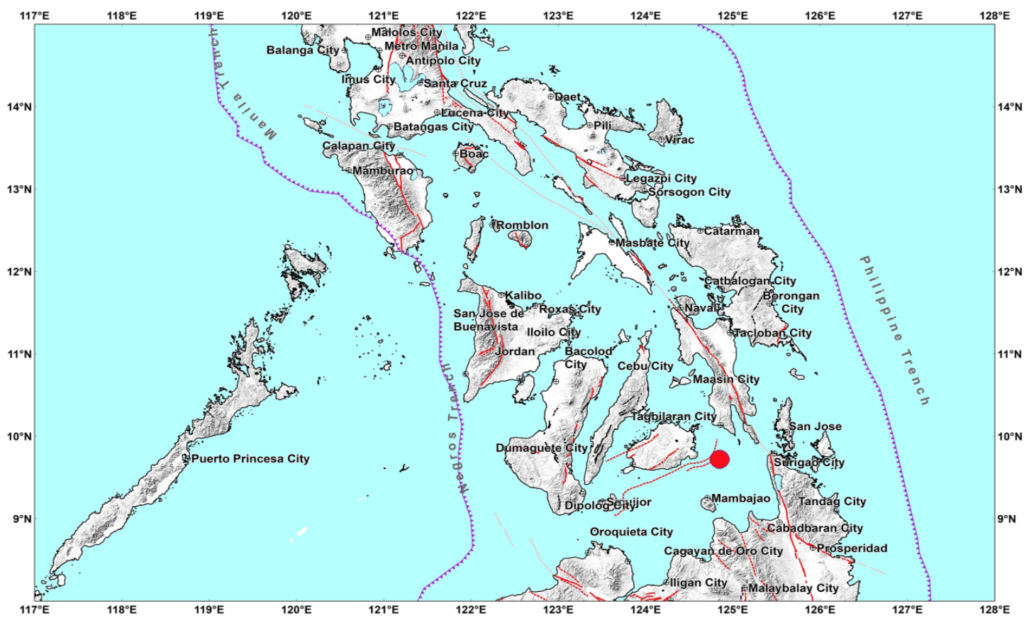 This is the usual scenario in the Philippines because we are under the Pacific Ring Of Fire where active and dormant volcanoes reside. The red dot represents the epicenter of the earthquake.