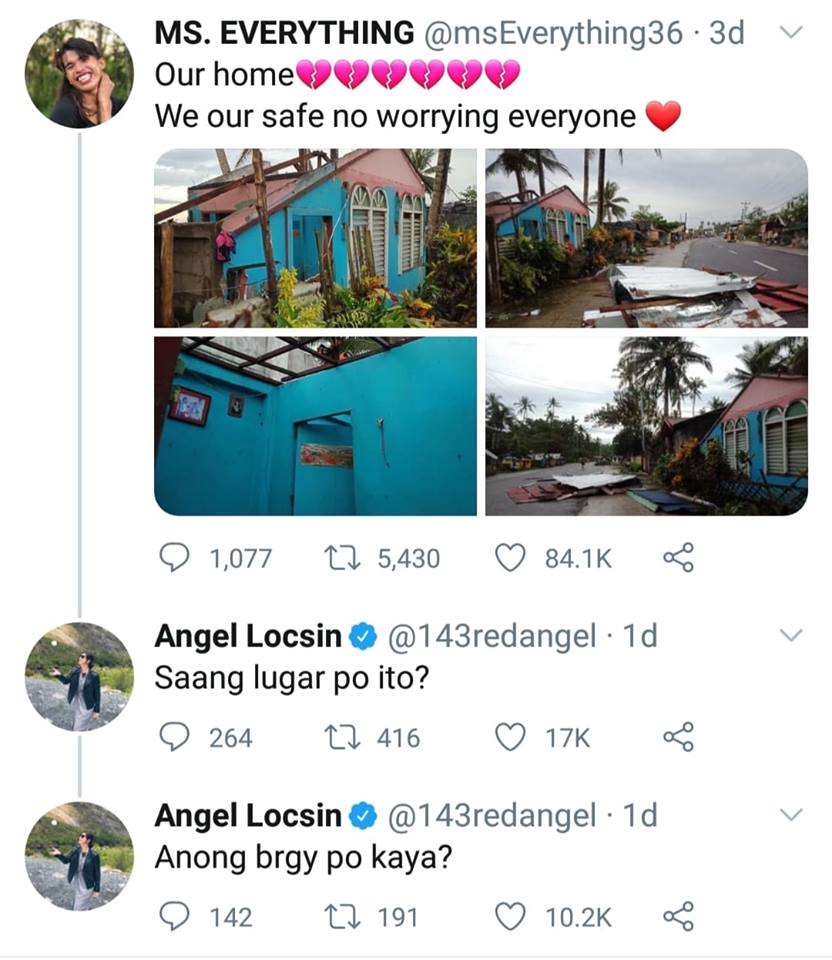 Ericka Maribojoc or “Ms. Everything” was extremely grateful for the actress Angel Locsin for reaching out to her when she needed help. Erika’s house in Calbayog City, Western Samar was destroyed by the Bagyong Ambo. The typhoon was in signal number 3.