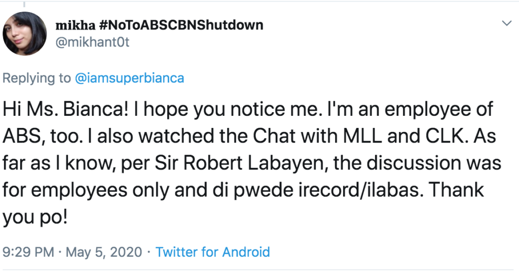 Mikha one of the employees of ABS-CBN stated that the live chat of Sir Robert Labayen is private. “Hi Ms. Bianca! I hope you notice me. I’m an employee of ABS, too. I also watched the Chat with MLL and CLK. As far as I know, per Sir Robert Labayen, the discussion was for employees only and di pwede irecord/ilabas. Thank you po!”