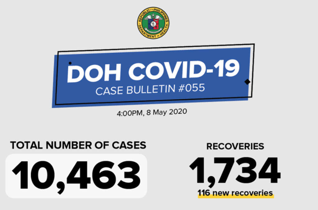 As of 4 PM today, May 8, 2020, the Department of Health reports 120 new cases (PH10344-PH10463) of COVID-19. NCR with additional 84 new cases, Region 7 with an additional 28 new cases and 8 new additional cases from different Regions. The total number of cases in the country is now at 10,463.