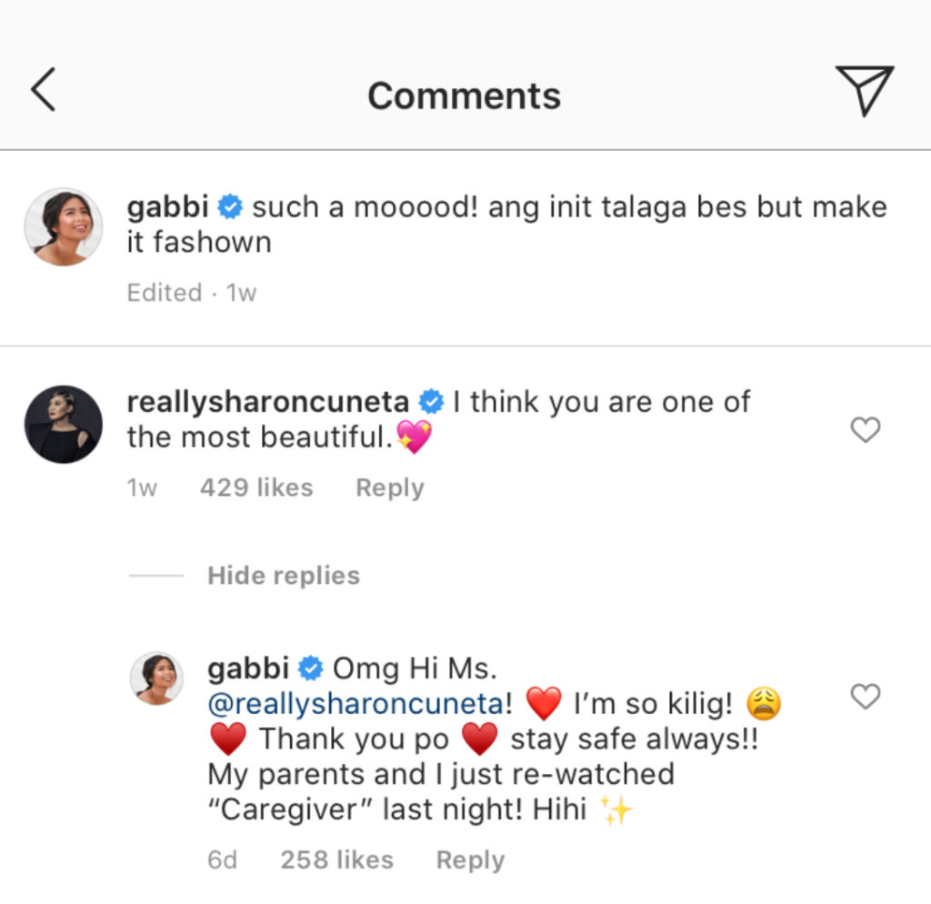 Gabbi revealed that she almost didn’t notice Sharon’s comment until her manager told her. “May dalawang photos na naka-upload sa Instagram ko, parang hindi ko na siya tinitingnan masyado.”