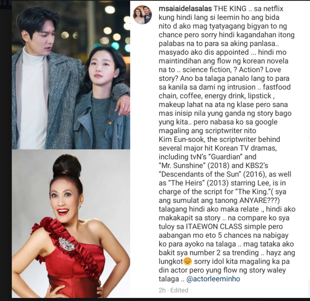 Top Trending topic online! Kapuso actress and comedienne Aiai Delas Alas comment over Lee Min Ho Kdrama series in Netflix titled “The King: Eternal Monarch” went viral on social networking sites such as Twitter. Ai Ai official Instagram account stated that “sa netflix kung hindi lang si leemin ho ang bida nito d ako mag tyatyagang bigyan to ng chance pero sorry hindi kagandahan itong palabas na to para sa aking panlasa.. masyado ako dis appointed … hindi mo maintindihan ang flow ng korean novela na to. science fiction? Action? Love story? Ano ba talaga panalo lang to para sa kanila sa dami ng intrusion. fastfood chain, coffee, energy drink, lipstick, makeup lahat na ata ng klase pero sana mas inisip nila yung ganda ng story bago yung kita.. pero nabasa ko sa google magaling ang scriptwriter nito.”