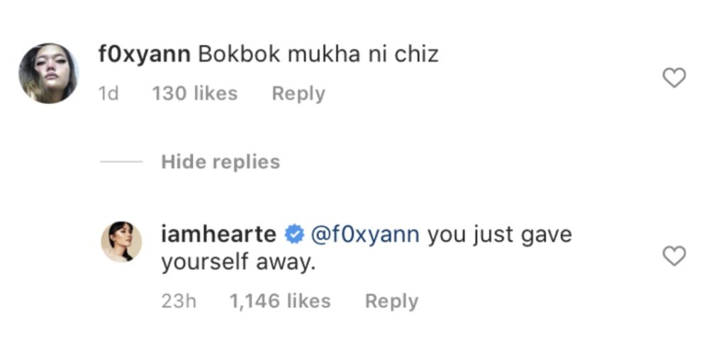 One basher insulted Chiz with her comment, “Bokbok mukha ni Chiz.” Heart didn’t hesitate to respond, she replied “you just gave yourself away.” Some netizens defended Heart and Chiz from the basher. Here are some of the comments: