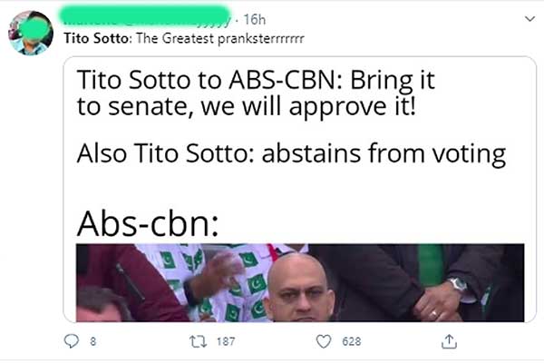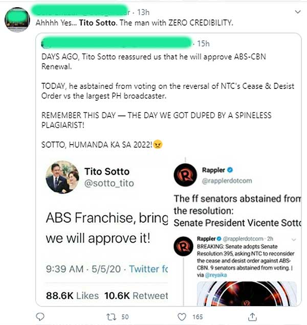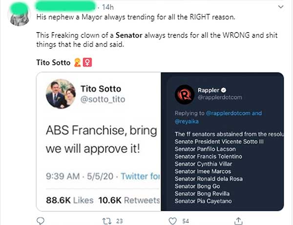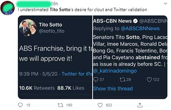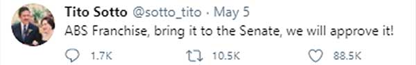 Netizens were disappointed of Senator Tito Sotto’s tweet back in May 5. He said, “ABS Franchise, bring it to the Senate, we will approve it!” and yet he abstained.
