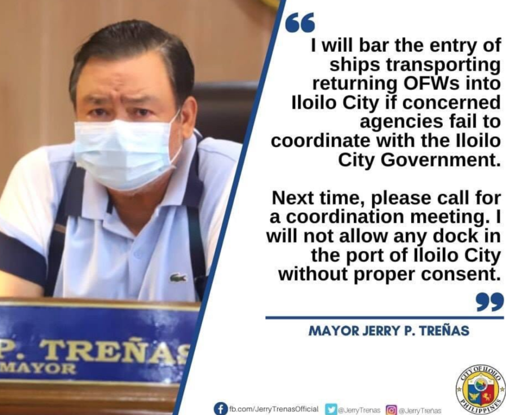 Mayor Treñas made it clear, he will only bar the entry of ships transporting returning OFWs to Iloilo City if concerned agencies CONTINUE TO FAIL to COORDINATE with the Iloilo City government and that he will not allow any dock in the port of Iloilo City “WITHOUT PROPER CONSENT.”
