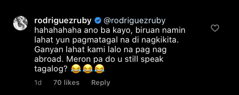 Ruby explained that it was only their inside joke and has meant nothing negative. She said “hahahaha ano ba kayo, biruan namin lahat yun pagmatagal na di nagkikita. Ganyan lahat kami lalo na pag nag abroad. Meron pa do u still speak tagalog?”