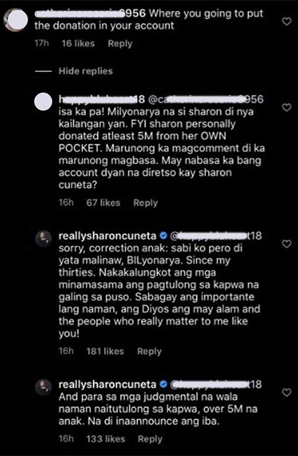 It was also Sharon who donated 5 million pesos for the relief supplies with regard to this COVID-19 pandemic. The netizen who defended Sharon replied, “Marunong ka magcomment di ka marunong magbasa.