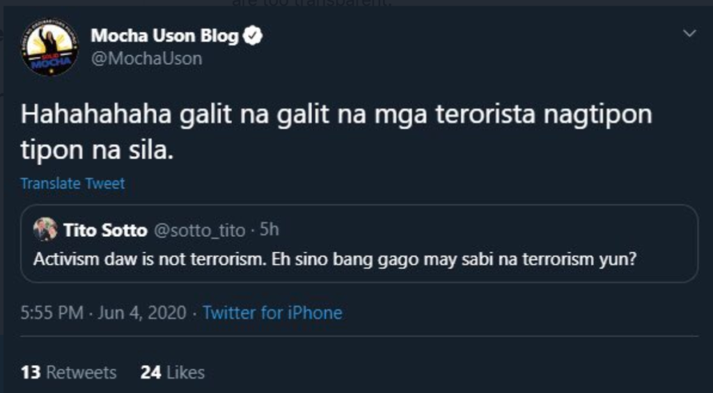 Senator Tito Sotto tweet, “Activism daw is not terrorism. Eh sino bang g*go may sabi na terrorism yun?” According to Netizen @JerikRola, “Mocha Uson called the protesters “mga terorista.” This further proves that anyone can be labeled a terrorist. Literally anyone! And this also answers Sen. Sotto’s question. Yes po, senator, si Mocha Uson po ang g*gong nagsabing terrorism ang activism.”