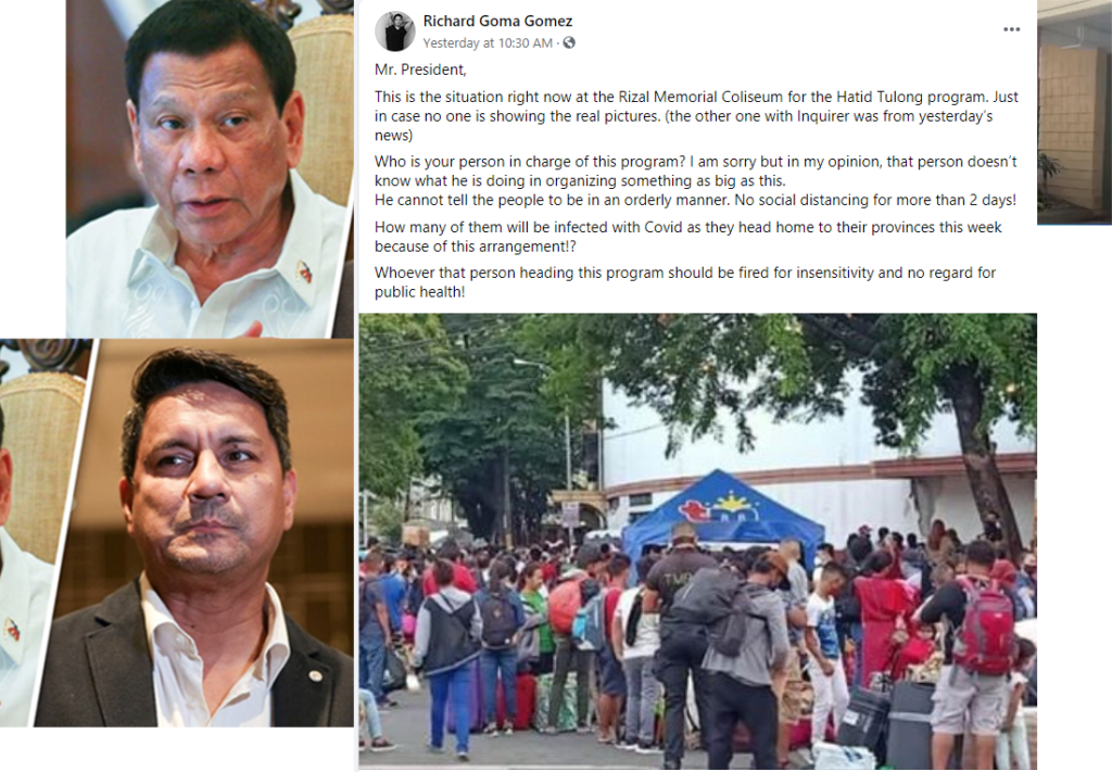 On his letter addressed to President Duterte, he was calling the attention of the in-charge of the “Hatid Tulong” program to address the situation and put strict compliance of the quarantine measure in order to avoid the spread of the virus. Gomez believes that the in-charge of “Tulong Hatid” is not knowledgeable to handle such a large number of people that because of too much crowded individual in one place the importance of proper social distancing was ignored for two (2) days.