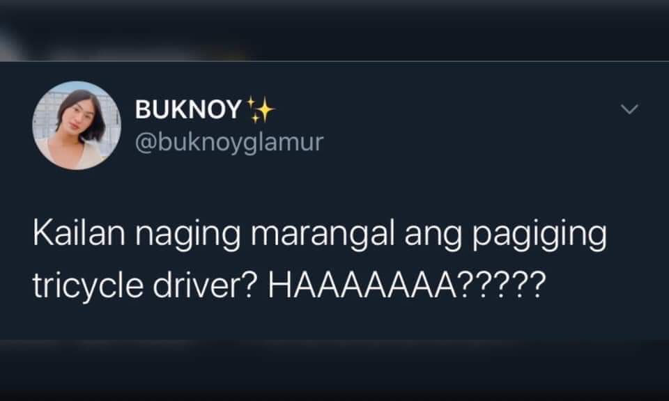 Dear #BuknoyGlamur , Erpat kong Tricycle driver nga pala. 300 lang kita nyan kada araw. Nangingitim at amoy usok pag umuuwi yan. Kung anong baba ng tingin mo, Siyang taas naman ng pangarap ko para sa Taong yan at dahil sa “Tricycle” na yan, Napatapos ako sa pagaaral at Naaabot ko na lahat ng pinangarap ko noon!