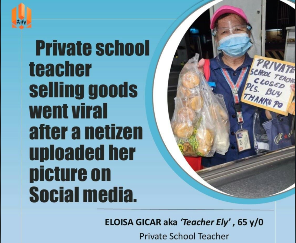 The private school teacher is identified as “Teacher ‘Ely’ Eloisa Gicar” 65-year-old go out on street to sell goods in order to survive after she lost her job due to CVID-19 pandemic.