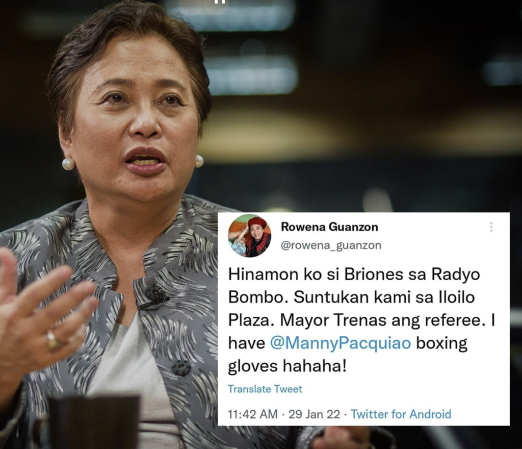 “Hinamon ko si Briones sa Radyo Bombo. Suntukan kami sa Iloilo Plaza. Mayor Trenas ang referee. I have @MannyPacquiao boxing gloves hahaha!” Guanzon said