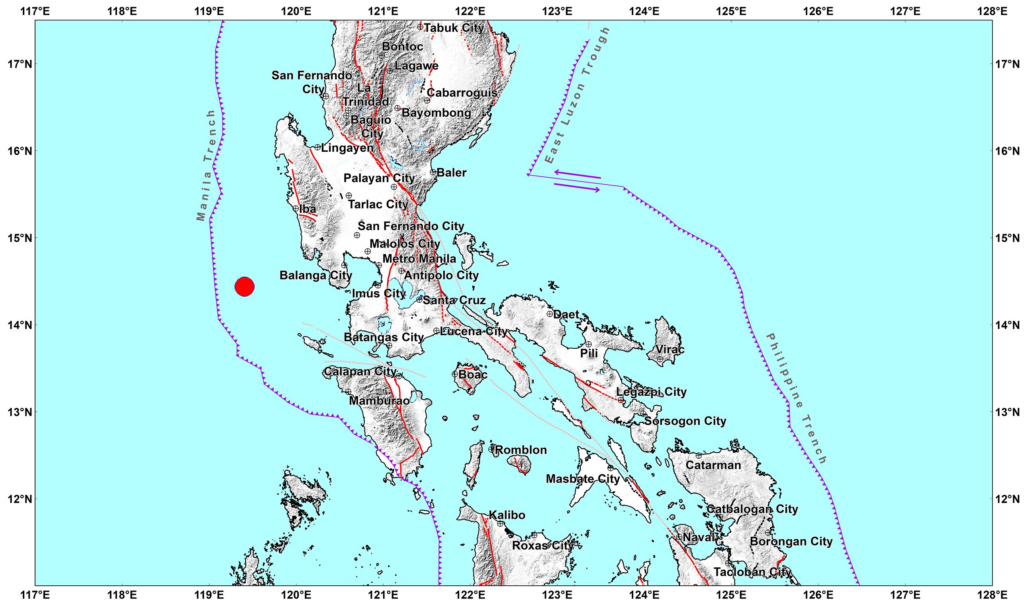 The earthquake, which struck at 8:09 a.m., had its epicenter at 14.11°N, 119.41°E, or 082 km N, 70° W of Lubang.