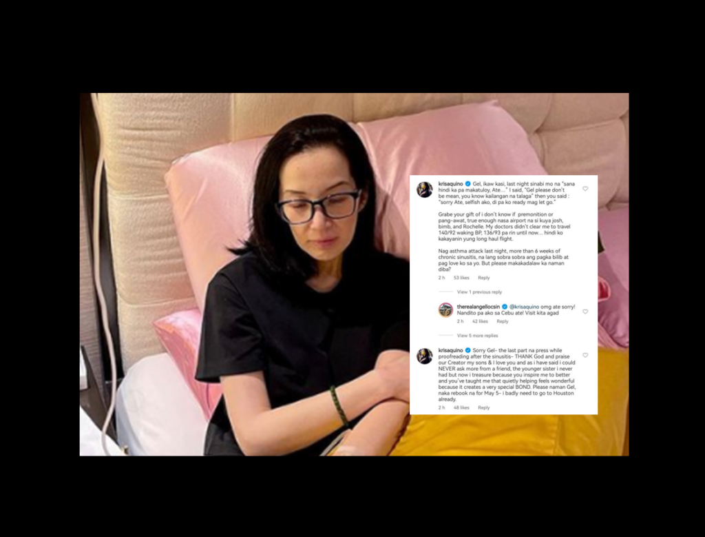 Her doctor disallows him from flying since her blood pressure had risen. Her two children, Joshua and Bimb, are already in the United States, as we reported yesterday. Kris joked that Angel was the reason she didn’t complete her trip.