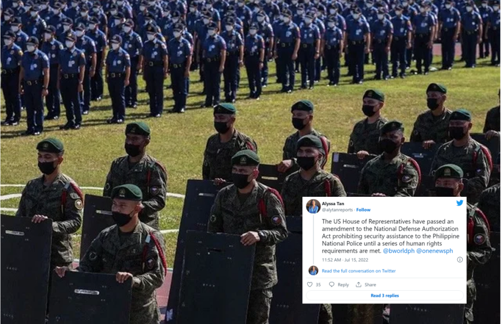 The United States House of Representatives approved a proposal to the National Defense Authorization Act that aims to “bawalan ang anumang “assistance” sa Philippine National Police (PNP) “hangga’t hindi nagagawa ang ilang human rights requirements.”