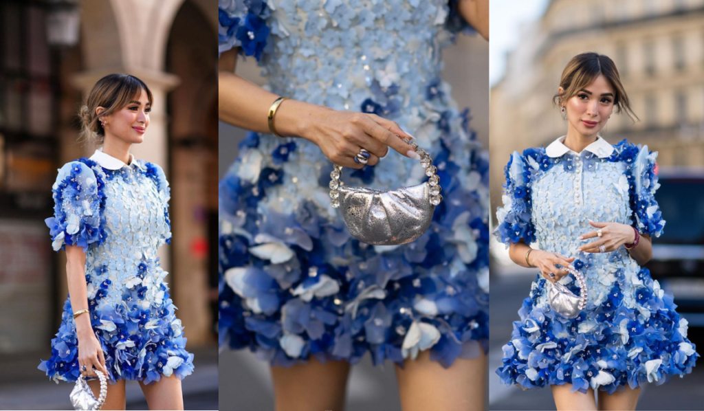 In her post, she stated, “Meet ‘Santiago,’ A bespoked modern-day terno paired with a floral appliqué micro-mini dress adorned with embroidered “mariposa” of varying shades and sizes by our local artisans.