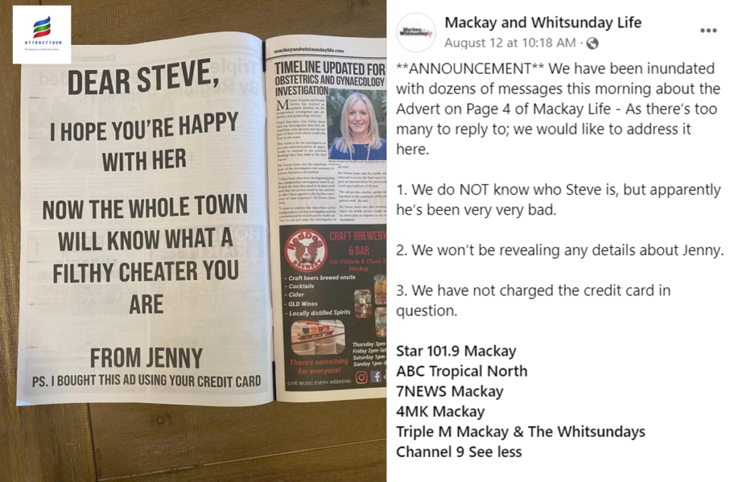 The Mackay and Whitsunday Life, an Australian-based weekly newspaper, gained international notoriety after a lady named “Jenny” bought a full page in the paper to reveal her cheating ex-boyfriend named “Steve.”