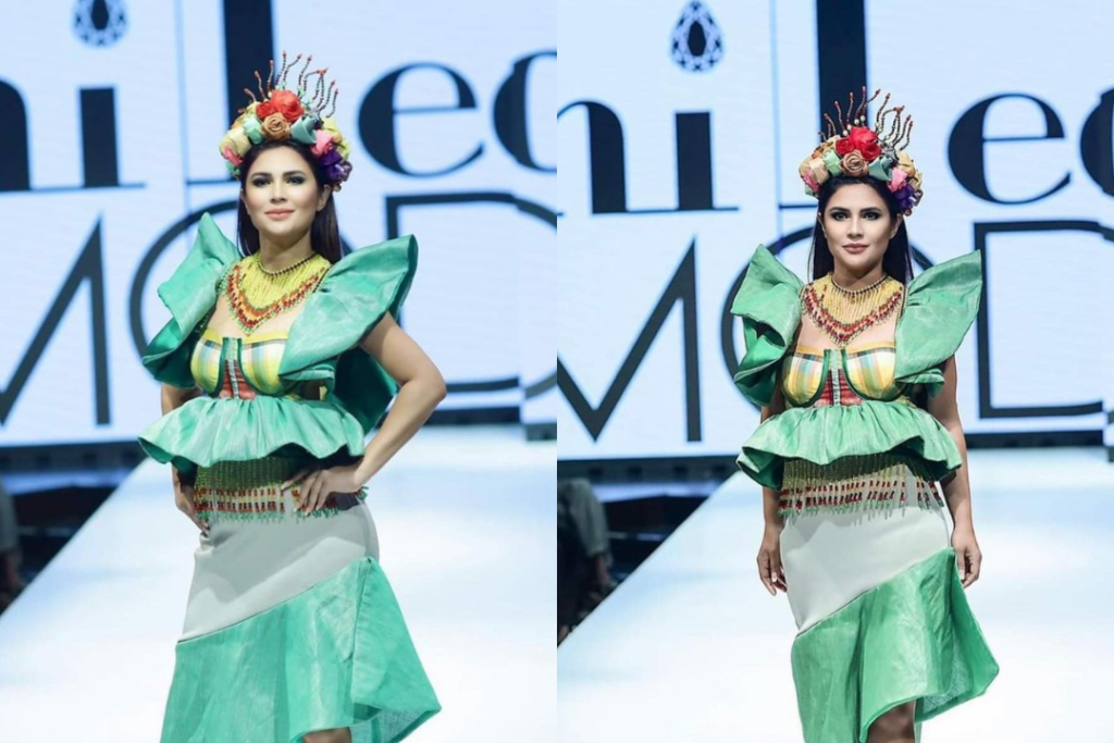 As seen on her Instagram page yesterday, Sept. 14, the singer strutted down the runway in a green Joy Soo dress with a colorful corset and John Cloma beadwork, paired with a colorful floral headpiece.