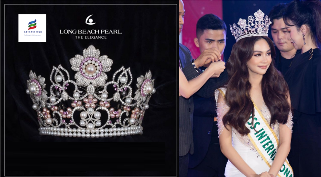 The crown, designed in collaboration with Long Beach Pearl, contains 333 pearls to represent “luck and survival,” 1,960 gems to commemorate the first year the Miss International pageant was held, and three pearls measuring up to 15 millimeters.
