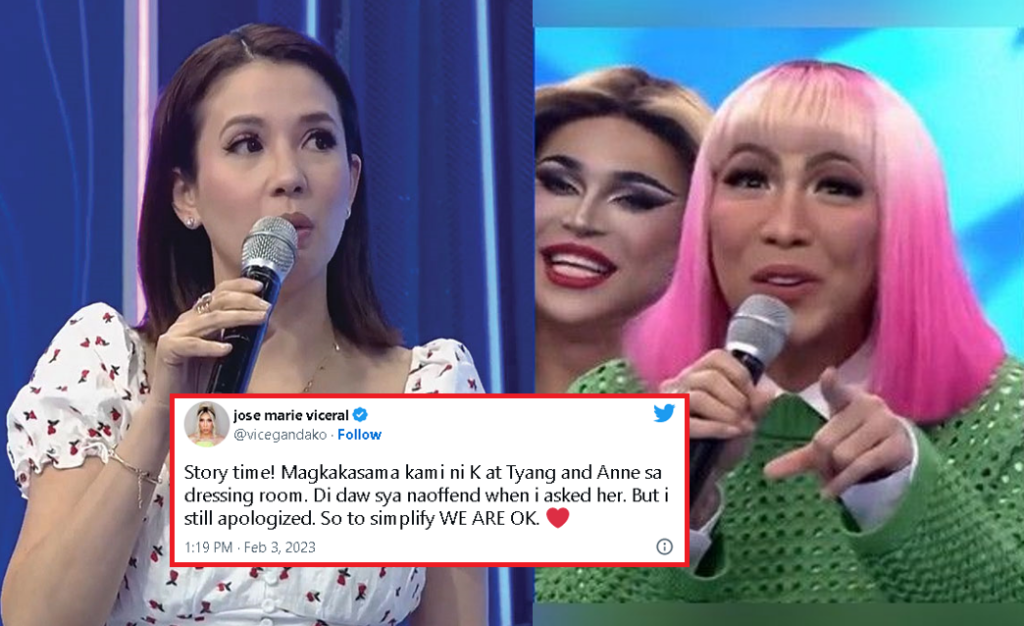 Vice tweeted, “Story time! Magkakasama kami ni K at Tyang and Anne’s dressing room. Di daw sya naoffend when I asked her. But I still apologized. So to simplify WE ARE OK.”