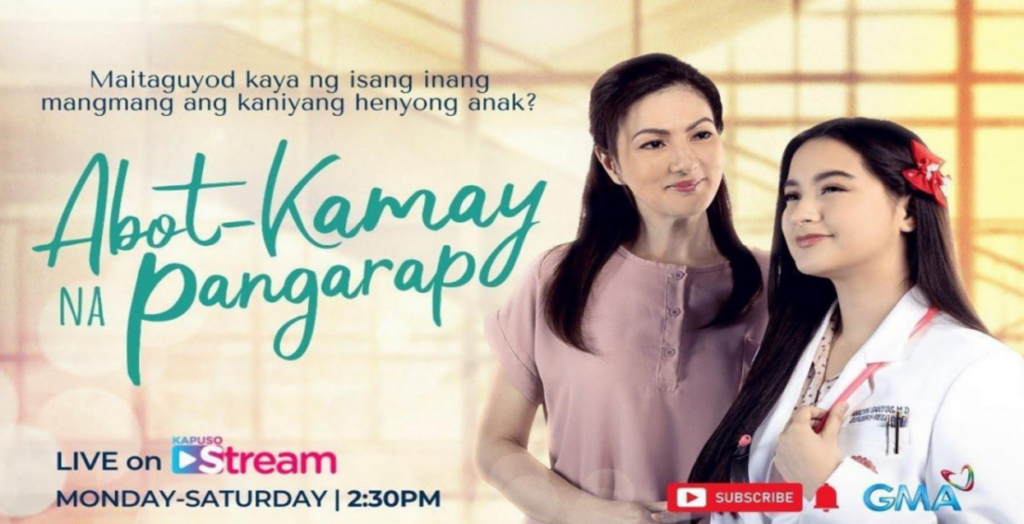 Abot-Kamay na Pangarap (international title: Hands on the Dream, The Dream Within Reach) is a Philippine television drama series broadcast by GMA Network. The series iscenterred on the 1996 film of the same title. Directed by L.A. Madridejos, it featured Carmina Villarroel and Jillian Ward. It debuted on September 5, 2022, on the network’s Afternoon Prime and Sabado Star Power sa Hapon line up replacing Apoy sa Langit.