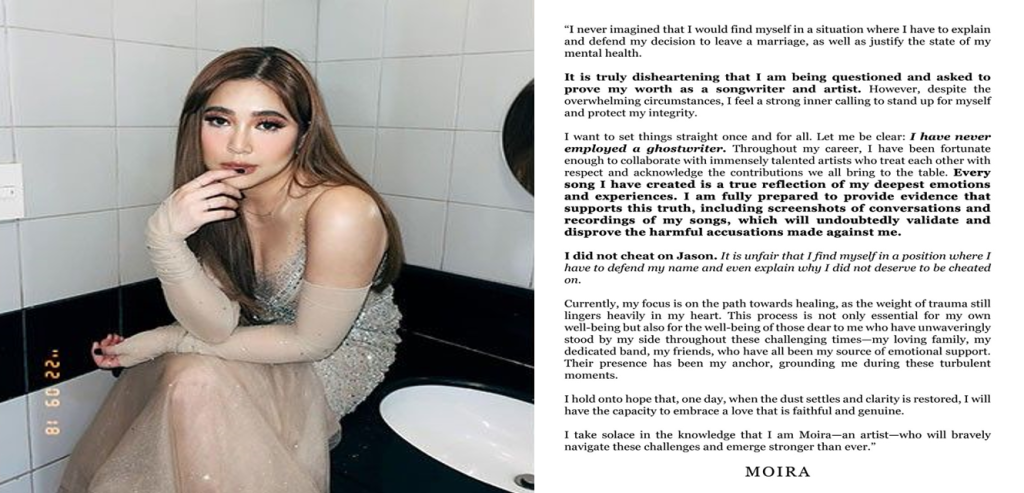 Moira dela Torre, a singer-songwriter, has spoken out about allegations that she got on her former husband, Jason Hernandez, and paid a ghostwriter.
