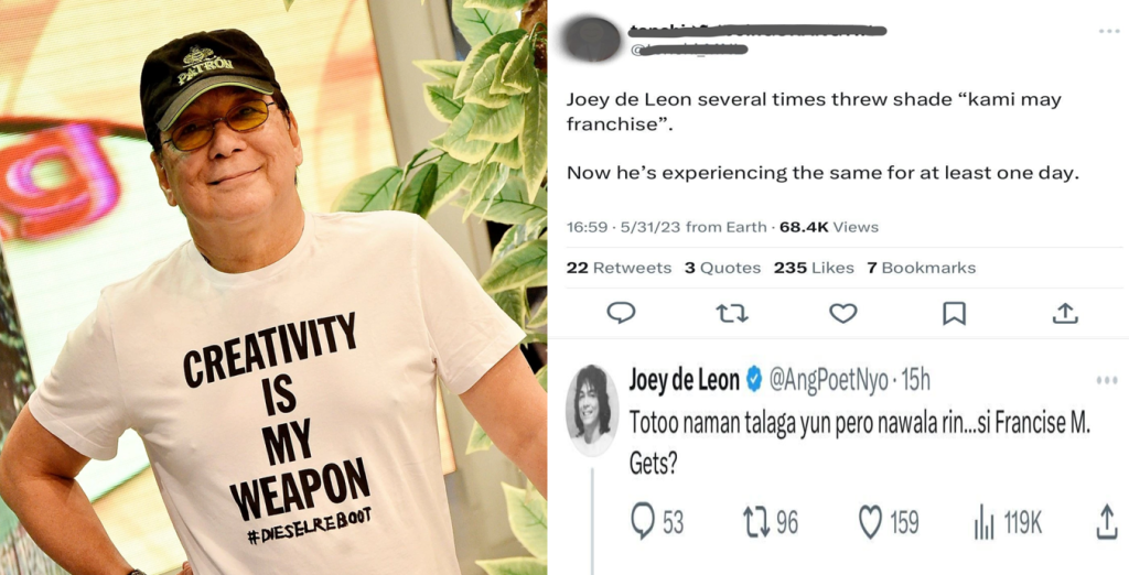 “Joey de Leon several times threw shade at “kami may franchise”. Now he’s experiencing the same for at least one day,” the post stated.