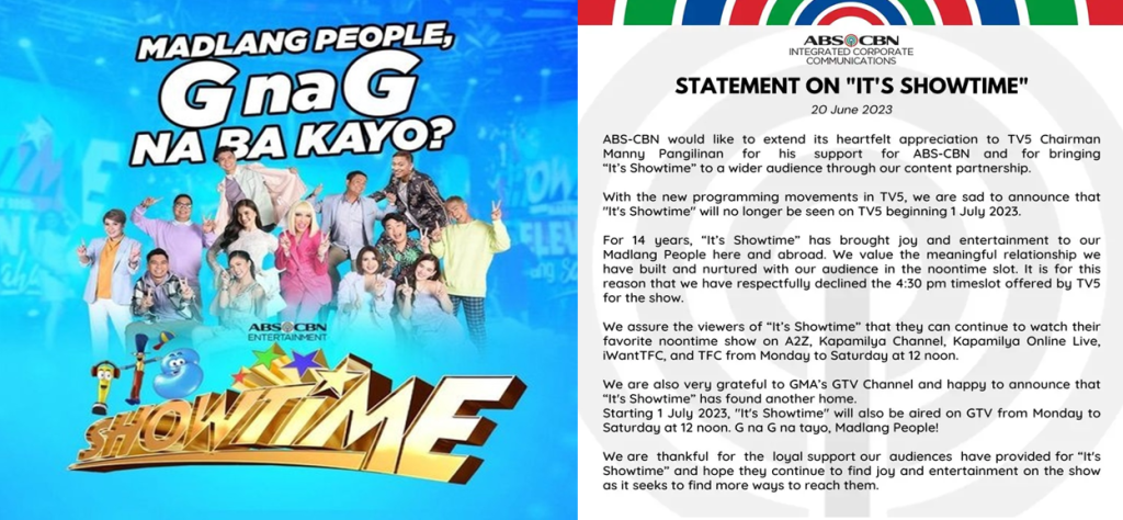 The Kapamilya network then stated that beginning July 1, 2023, It’s Showtime would also air on GTV, for which they are grateful to GMA.