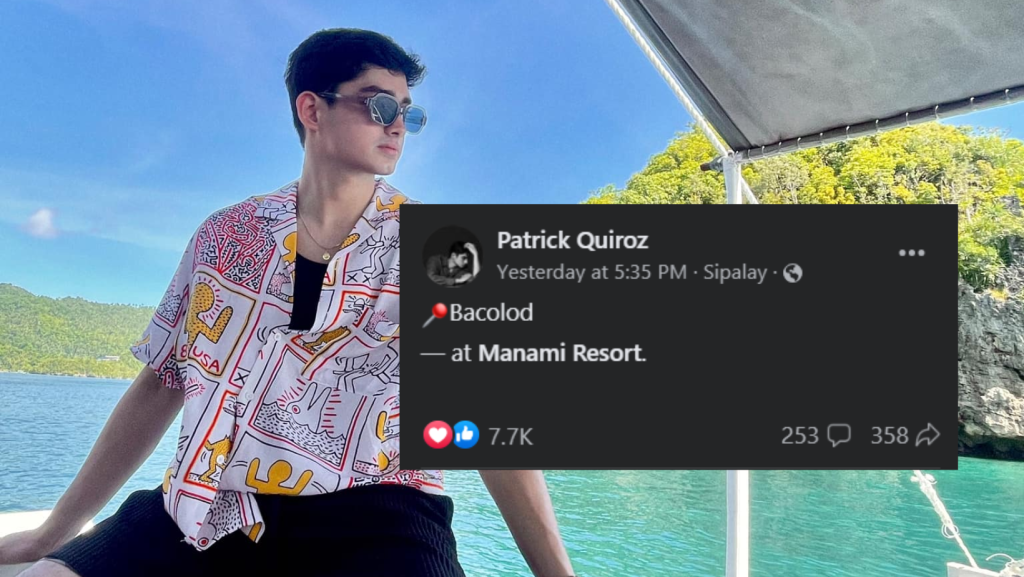 On Facebook, some netizens were offended after Patrick Quiroz marked his location by mistake. Instead of tagging Sipalay City on his photo, he tagged Bacolod City. The young actor was at Manami Resort based on his photo.