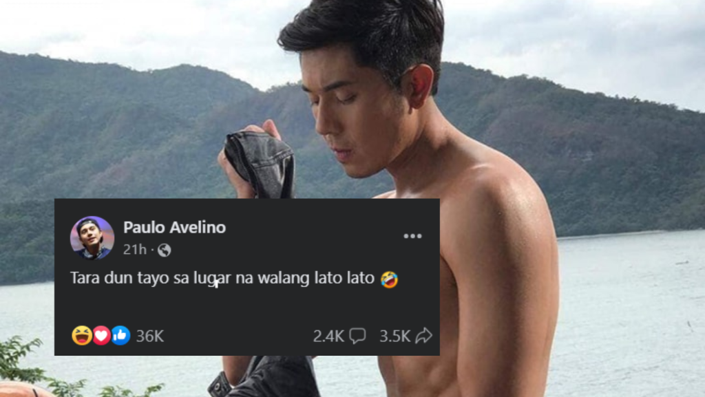 Paulo Avelino, a celebrity, posted a topless photo of him with a cation, “Tara dun tayo sa lugar na walang lato lato [laughing emoji]”.