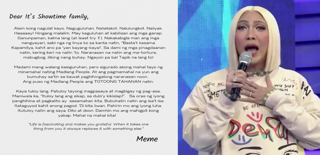 “Dear ‘It’s Showtime’ family, alam kong nagulat kayo. Naguguluhan. Natatakot. Nalulungkot. Naiiyak. Haaaaay! Hingang malalim,” he stated in his post. “May kaguluhan at kabilisan ang mga ganap. Gayunpaman, kalma lang (at least try).”