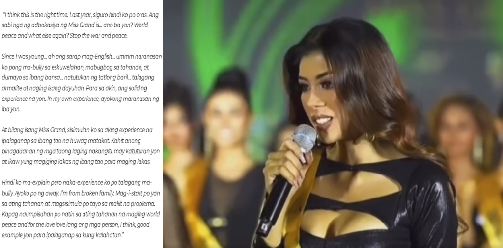 “Just checked the list of the candidates this year in Miss Grand International Philippines and your name is the only one that is hyperlinked, meaning you’re famous enough to be in the Wikipedia and you have millions of followers. I had the opportunity to meet and interviewed Mr. Nawat [Itsaragrisil, Miss Grand International president] last year and I know he loves someone who’s got a big social media following. Apart from your big social media following, what else have you got in order to win the crown?”
