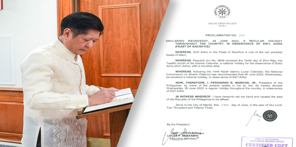 President Ferdinand Marcos Jr. has announced June 28, 2023, as a regular national holiday in the Philippines in order to acknowledge and respect the Islamic practice of Eid’l Adha.